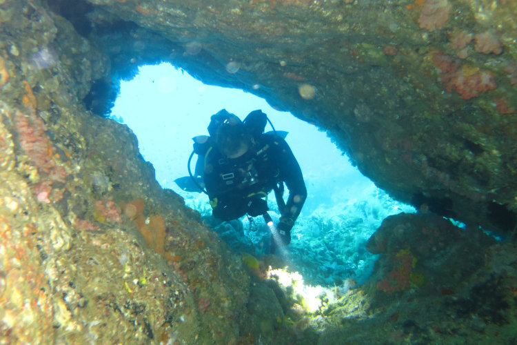 This purposely sunk 30m long cargo ship sits upright and orientated east to west with the bow most westerly. Sunk in 2003 it has been attacked by the currents and some of the structure has collapsed. An ideal teaching site for wreck penetration and a very enjoyable dive for AOW level divers. The maximum depth is 30 meters and the dive departs into the bay for safety stops in the reefs. Expect to meet very large bat fish up close and personal here.