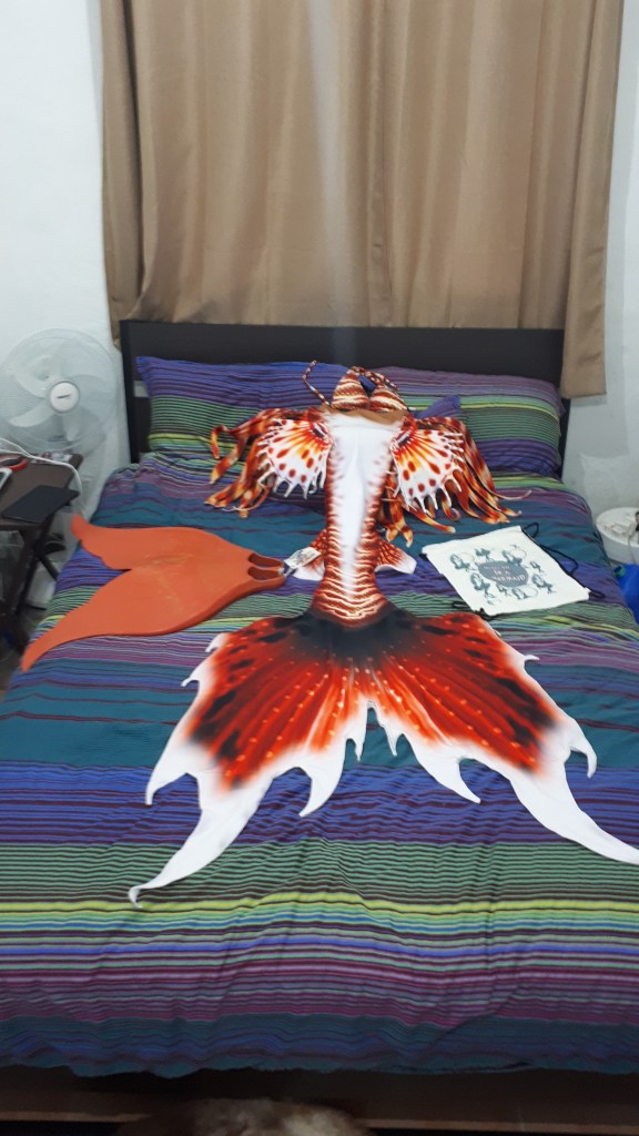Mermaid tail and Fin – To start with you might want to use the all in one designs that pull on and off quickly but in time you may want to professionalise your tail/fin choice. There are custom made tails that you can fit over your chosen fin that will make you look splendid indeed. In fact my very own tail is designed like a lionfish and I use the Mahina fin. There are of course other fin styles. If you like mine then I have an arrangement with MermaidAvenuePH to ensure we can prioritise your order.